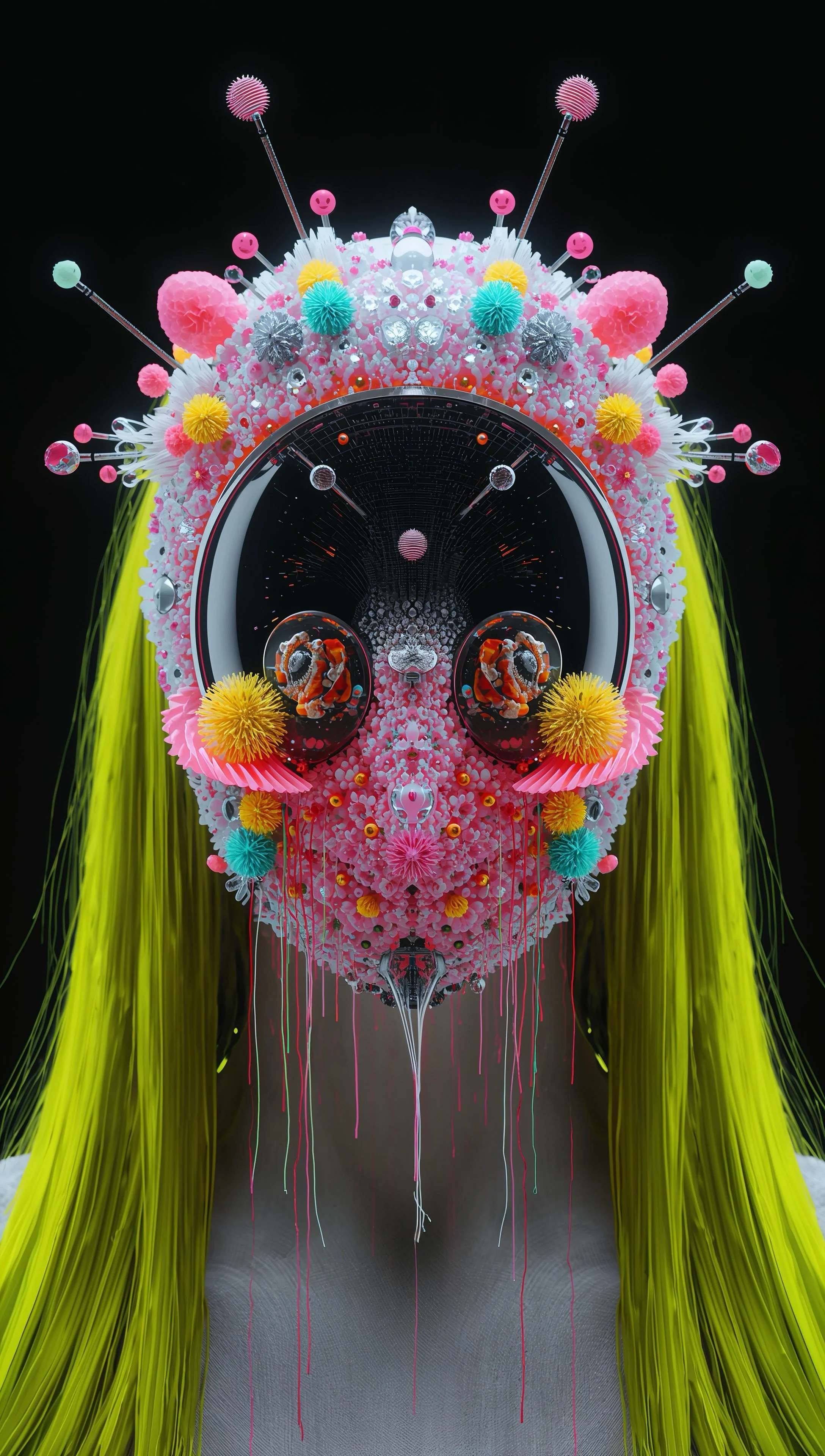 The work reflects on the ways contemporary life unfolds within networks of communication, emotional signals, and technological mediation. Emoji-like symbols, luminous patterns, and synthetic surfaces appear as carriers of affect, circulating through the faces like visible currents of thought and feeling.