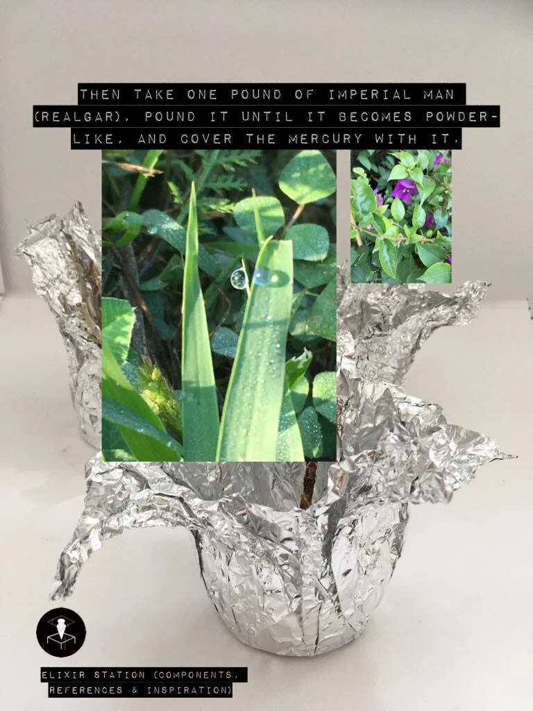 Images from the first version of the research album accompanying work on the MetaGarden1 project. Documentation of the collection of elements for the Elixir Machine, reading of historical recipes for medicaments and elixirs, deciphering the meaning behind procedures and figuring out ingredient behind coded names.